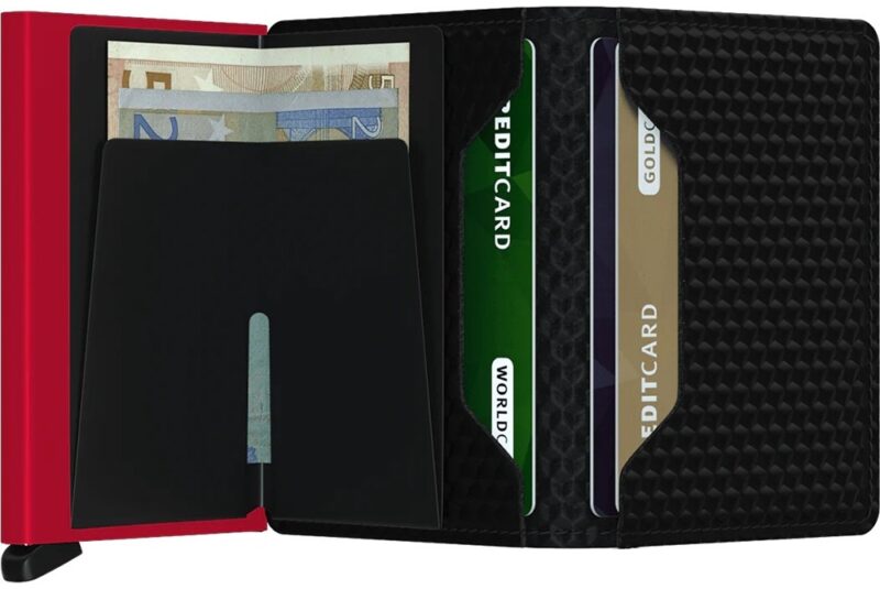 Gracias a su perfil delgado, la Slimwallet cabe perfectamente en todos los bolsillos. La cubierta exterior se corta con una longitud más larga para crear más espacio para tarjetas, billetes y tickets. El corazón del producto es el Cardprotector, cuyo mecanismo permite extraer las tarjetas con un simple movimiento, evitando que se doblen, rompan o lean sin que nos demos cuenta.