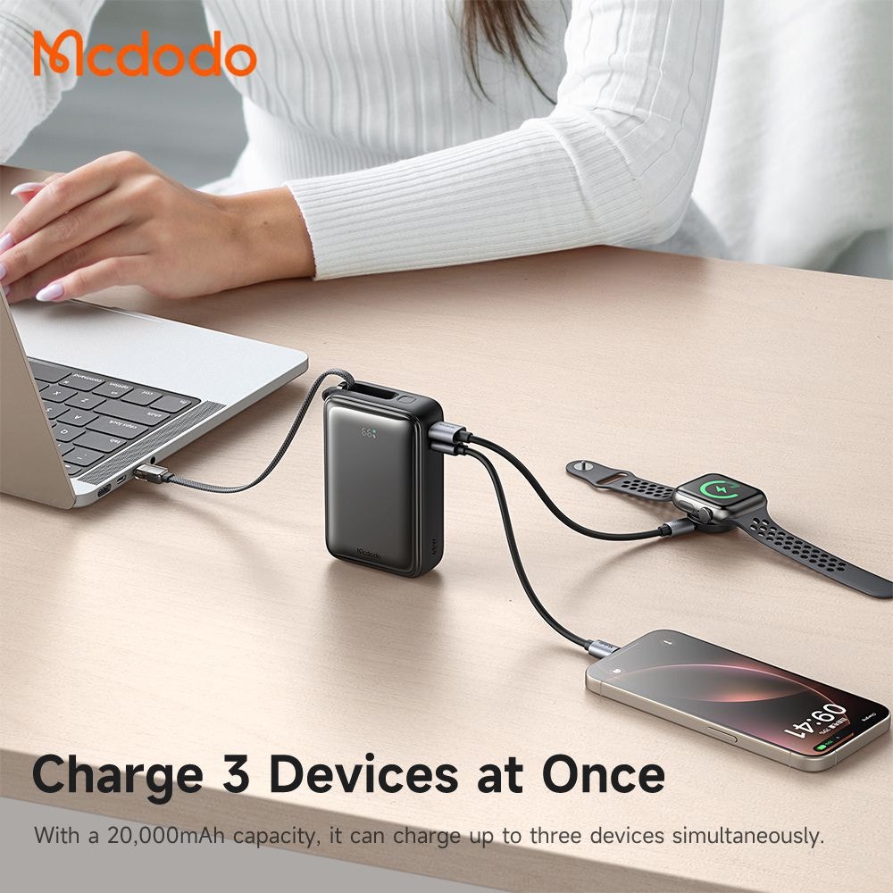 Energía de alto rendimiento en tu bolsillo El Mcdodo MC-637 es un banco de energía premium diseñado para usuarios exigentes. Con una capacidad de 20000mAh y una salida de hasta 65W, este cargador portátil es capaz de alimentar desde smartphones hasta laptops como el MacBook Pro. Su diseño compacto y seguro lo convierte en el compañero ideal para viajes, trabajo remoto y jornadas intensas.