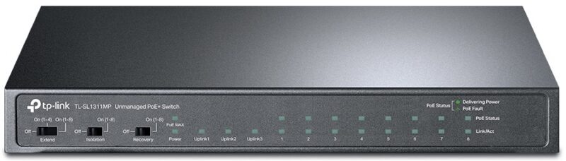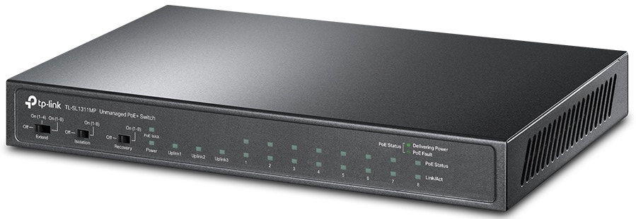 El switch TL-SL1311MP de 8 puertos 10/100 Mbps + 4 puertos con PoE+ proporciona alto rendimiento, bajo coste, fácil de usar, sin cortes para mejorar la red.