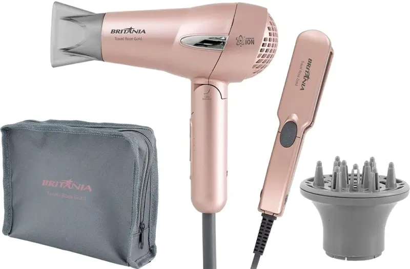Fullbai / Belleza y Salud / Electrobelleza / Secadores y planchas de cabello / Kit Travel Rose Gold Britânia Secador y Planchita – (Bivolt)