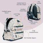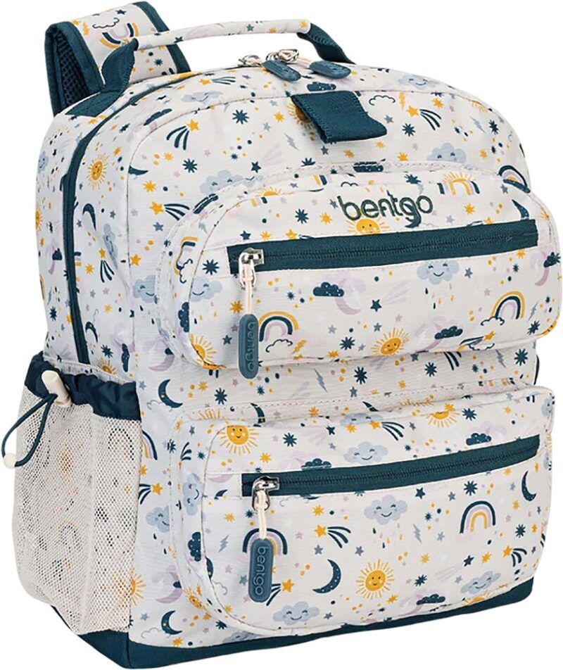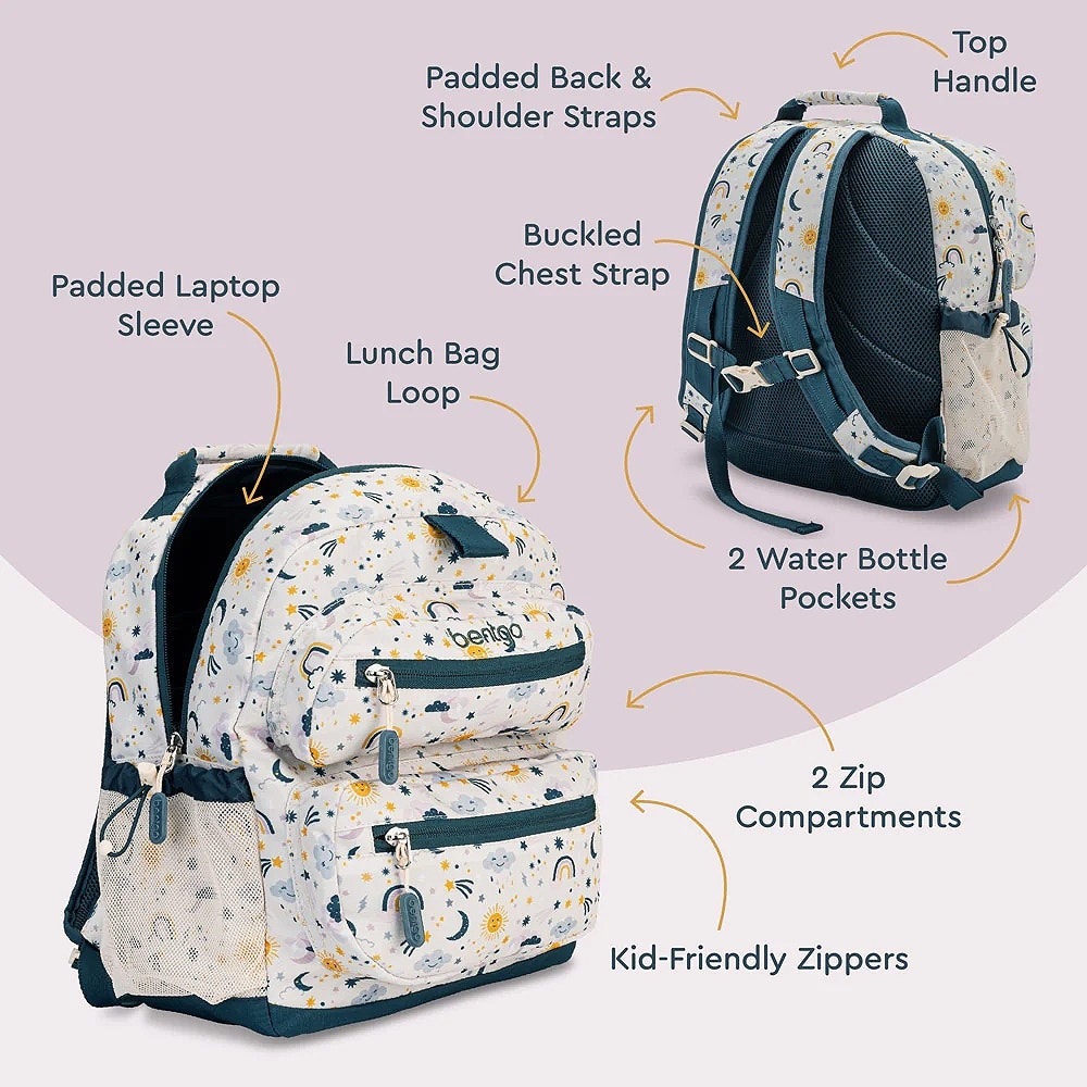 MUCHO ESPACIO: el espacioso compartimento principal tiene capacidad para un portátil, una tableta, una carpeta de 3 anillas, cuadernos y mucho más. Además, los dos compartimentos externos con cremallera son perfectos para guardar objetos más pequeños como bolígrafos, reglas e incluso aperitivos de preescolar, guardería y primaria. Añade 2 botellas de agua Bentgo a los bolsillos laterales de malla o lleva algunos utensilios Bentgo para disfrutar de las comidas sobre la marcha.